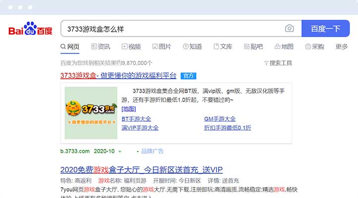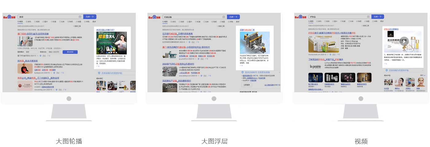搜索結果首頁黃金位置,也可呈現在百度新聞、百度知道、百度百科、百度圖片、百度視頻、百度地圖等子頻道
